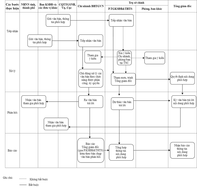Đối với Chi nhánh BHTGVN: (i) Tiếp nhận, xử lý, phản hồi các nội dung phối hợp từ NHNN Chi nhánh tỉnh, thành phố, Ban KSĐB và các đơn vị khác có liên quan đến TCTGBHTG được KSĐB do Chi nhánh BHTGVN quản lý theo quy định về phân công, ủy quyền; (ii) Báo cáo Tổng Giám đốc BHTGVN (qua phòng TGKSĐB&THTS) kết quả xử lý các nội dung phối hợp cùng bản chụp văn bản phản hồi.