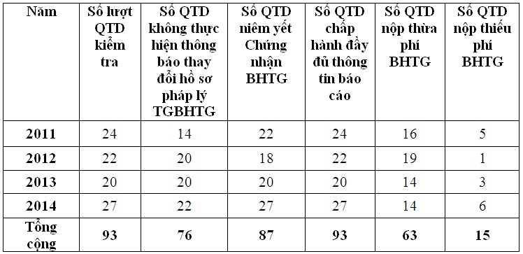 Qua bảng số liệu trên cho thấy, số lượt các tổ chức tham gia BHTG vi phạm các quy định về BHTG vẫn diễn ra trong các năm từ năm 2011 đến 2014 như : 76/93 lượt QTD không thực hiện thông báo thay đổi hồ sơ pháp lý tham gia BHTG, 6/93 QTD không niêm yết hoặc niêm yết chưa đúng chứng nhận BHTG, 63/93 QTD nộp thừa phí BHTG, 15/93 QTD nộp thiếu phí BHTG. Tình trang trên do một số nguyên nhân sau: