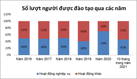 Trong năm 2016, hoạt động nghiệp vụ chỉ được đầu tư vào 24% thì đến hết tháng 10 năm 2021, tỷ lệ này đã đạt 54% về số khóa đào tạo. Cũng như vậy, tỷ lệ về số lượt học viên được đào tạo nghiệp vụ trong 6 năm qua đạt trung bình từ 50,5%, trong đó cao điểm nhất là năm 2020 với tỷ lệ 70%.