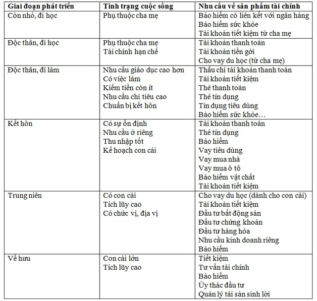 Bảng 1: Các giai đoạn phát triển của con người và đi kèm với nhu cầu về sản phẩm tài chính