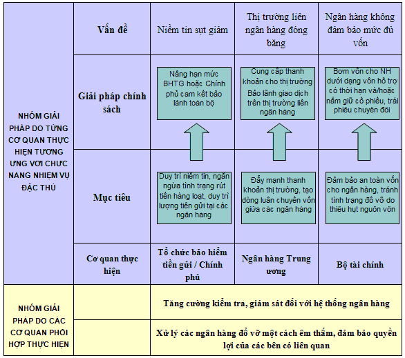 Bảng dưới đây tổng kết mô hình chung các giải pháp do từng thành viên tham gia Mạng an toàn tài chính thực hiện theo chức năng đặc thù riêng của mình và các nhóm giải pháp do các cơ quan phối hợp thực hiện nhằm mục tiêu duy trì ổn định tài chính nói chung và bảo vệ người gửi tiền nói riêng.
